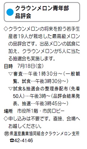 7月18日(金)に袋井市役所にて青年部品評会を開催します。 試食やメロンが当たる抽選会などを実施します。 たくさんの方のお越しをお待ちしております。 詳しくは↓ 青年部品評会.jpg